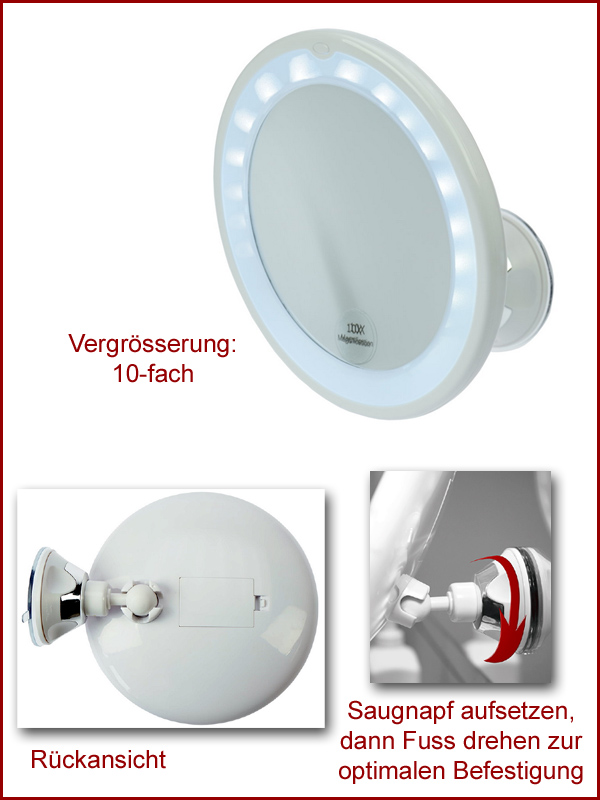 Kosmetikspiegel Saugnapf mit LED Beleuchtung, 5- und 10-fache Vergrößerung